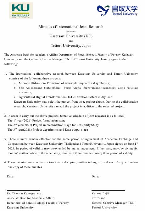 本学とタイのカセサート大学(KU)との国際共同研究を2026年度から開始することで一致しました。2025年10月8日KU(バンコク)においてキックオフミーティングを開催しました。国際共同研究は、PJ1(マイクロバイオーム)、PJ2(ポーラスアルファ)、PJ3(AI農業システム)の中からKUがプロジェクトを選択でき、途中で追加することができます。