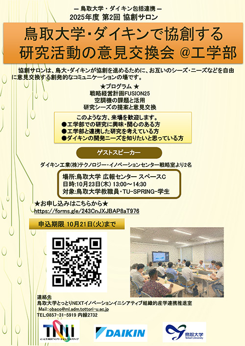 鳥取大学ーダイキン工業株式会社包括連携の枠組みの一環として、お互いのニーズとシーズなどを自由に意見交換する創発的なコミュニケーションの場です。