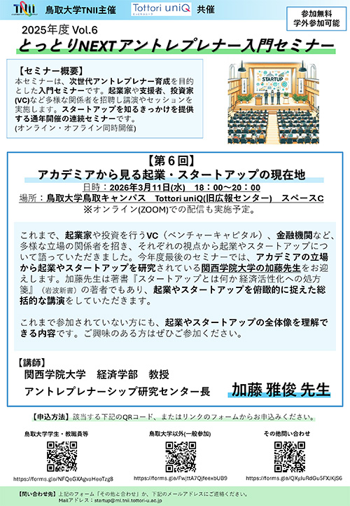 この度、鳥取大学「とっとりNEXTイノベーションイニシアティブ(TNII)」が主催します、「とっとりNEXTイアントレプレナー入門セミナー」の第6回を開催いたします。